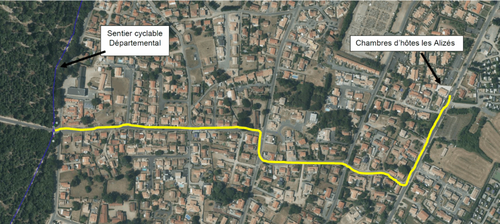 La chambre d’hôtes Les Alizés n’est située qu’à 1km de La Vélodyssée. Vous rejoignez facilement votre hébergement en quittant la piste cyclable en forêt au niveau de la rue de la Parée Basse. Au bout de la rue, au stop, tournez à droite sur la rue de la Croix Gaillarde puis à gauche sur la rue Sainte-Thérèse. Vous poursuivez ensuite sur la rue Louis Pouvreau avant de tourner à gauche, rue de La Barre de Monts. Vous êtes arrivé !